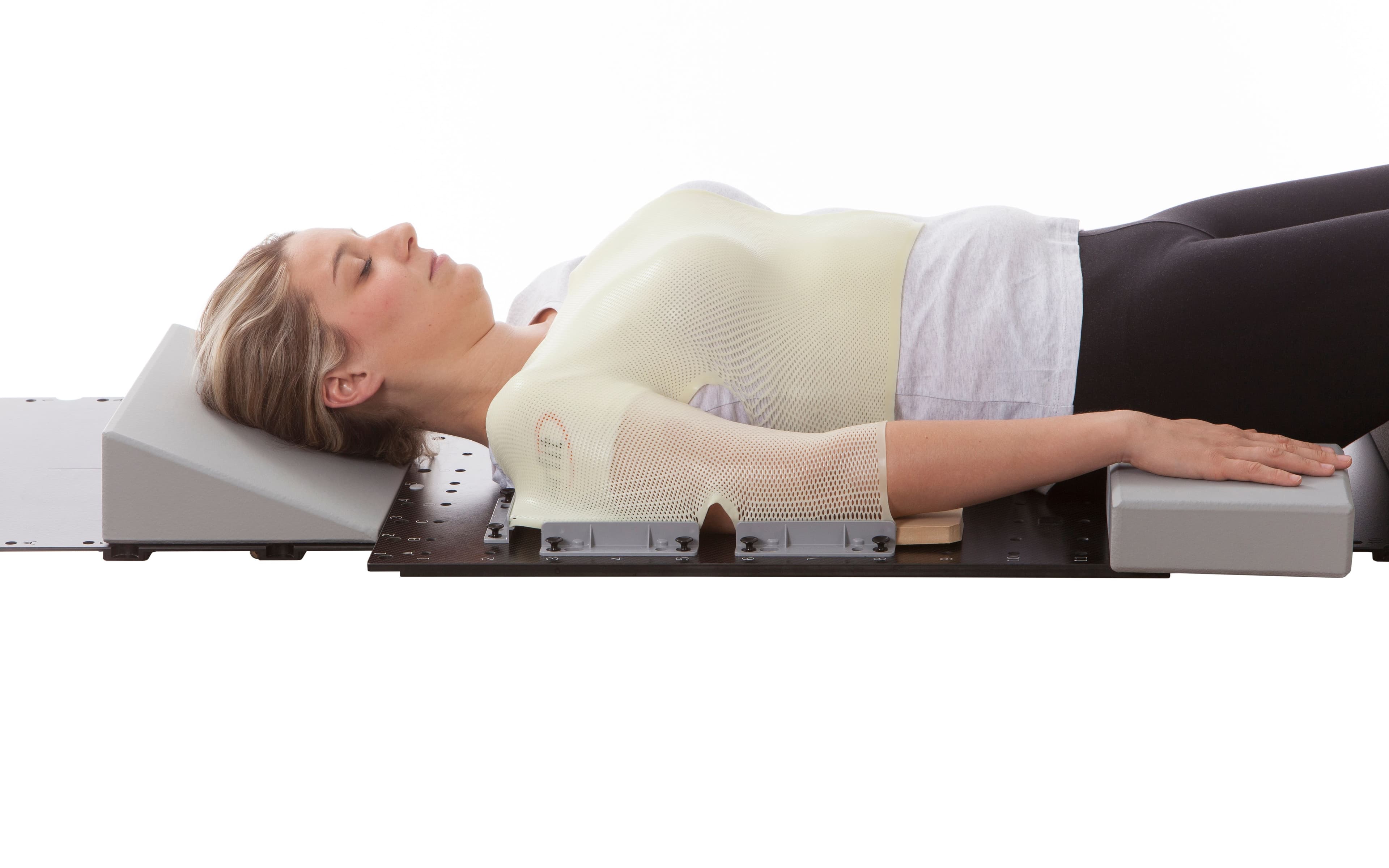 Patients can be immobilized while lying down or sitting beside the couch. Thermoplastic masks are formed over the elbow and hand for reproducible positioning. Soft cushions are used under the arm to maintain comfort throughout the session.